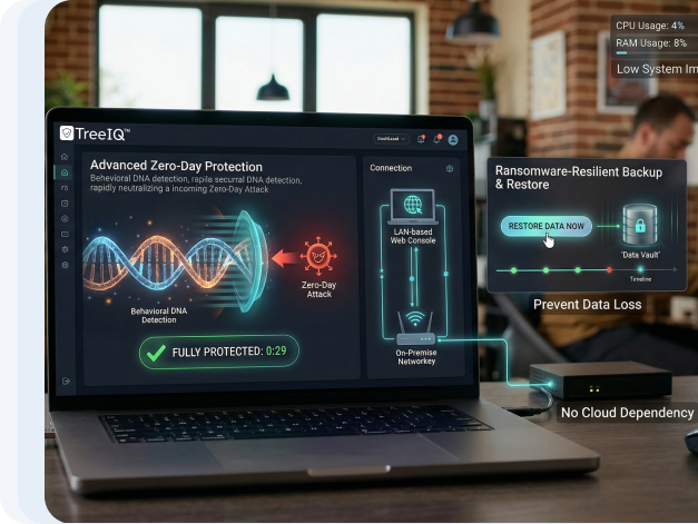 TreeIQ™ Protect EES SOHO is an all-in-one endpoint security solution designed for small offices that need maximum protection with minimal complexity. It combines advanced malware defense, ransomware protection, data loss prevention, secure backup, and web management — all in a lightweight, easy-to-deploy package.