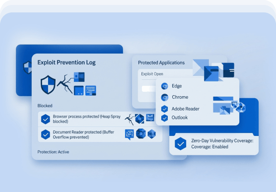 Blocks attack techniques targeting browsers, document readers, and system components.