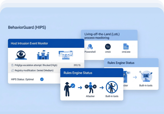 Detects known and unknown threats by analyzing how programs behave — not just their signatures. Stops new and emerging malware before damage occurs.