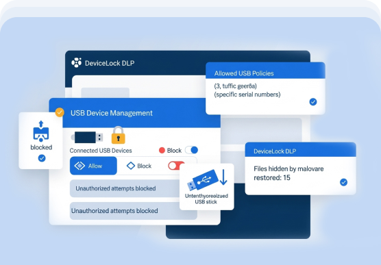 Blocks unauthorized USB devices, prevents data theft via removable drives, and scans infected USB devices.