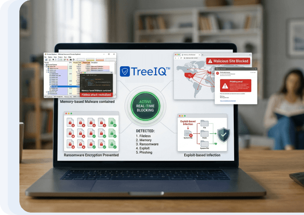 TreeIQ™ Protect Security Home combines behavioral detection, ransomware defense, phishing protection, USB security, and lightweight performance to help reduce everyday cyber risk for personal devices.